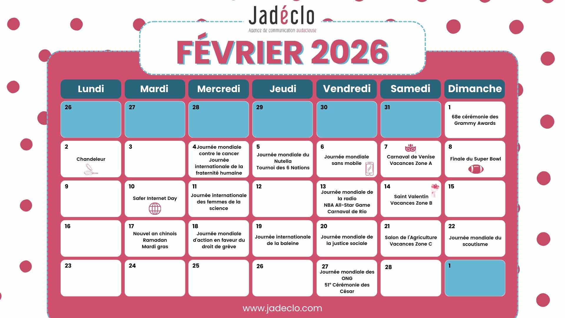 On ne perd pas le rythme et on continue de vous accompagner dans vos campagnes de marketing et de communication ! Jadéclo vous livre un récapitulatif des événements principaux du calendrier marronnier février 2026 !